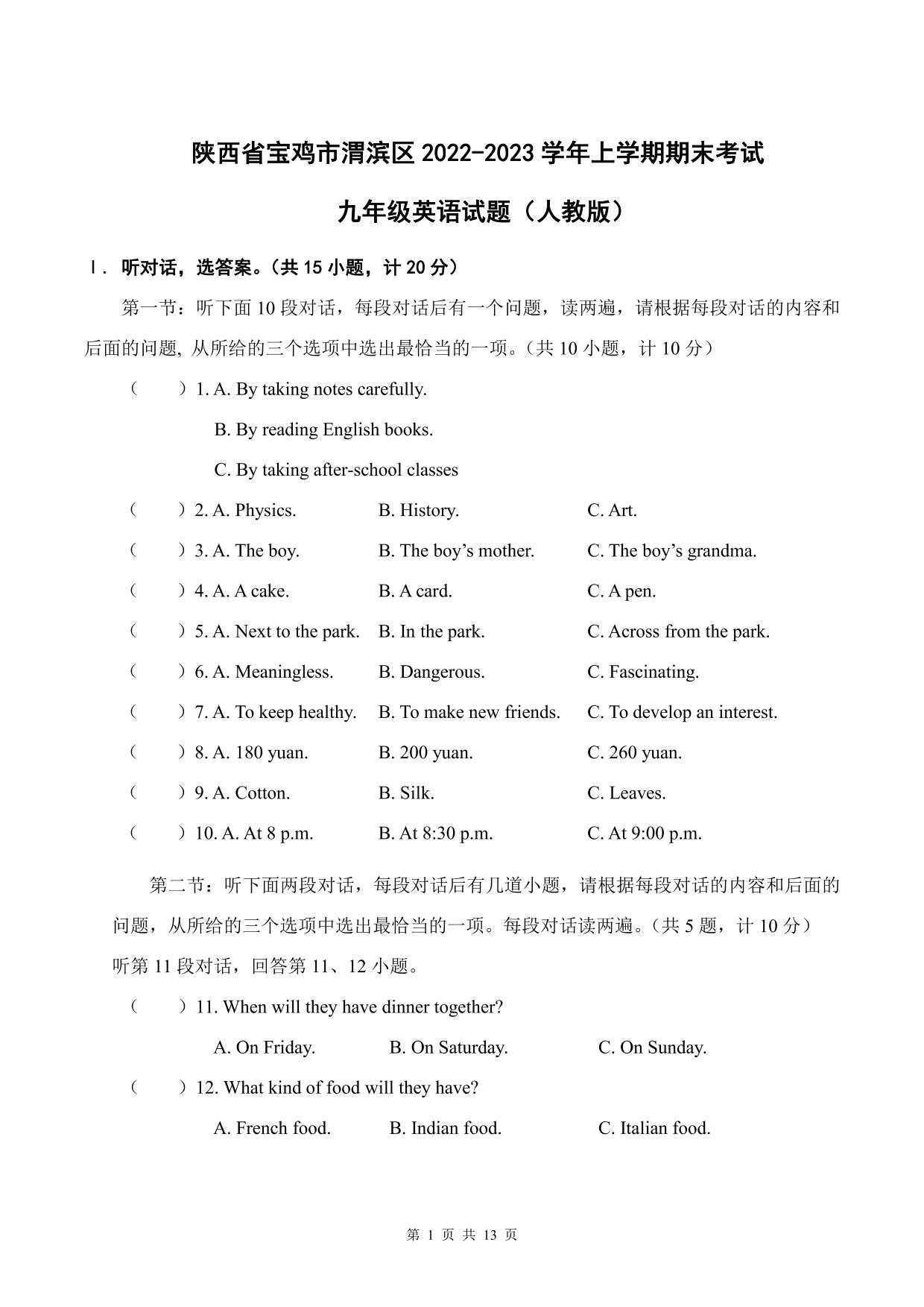 陕西省宝鸡市渭滨区2022—2023学年上学期期末考试九年级英语试题(人教版)【无听力音频】