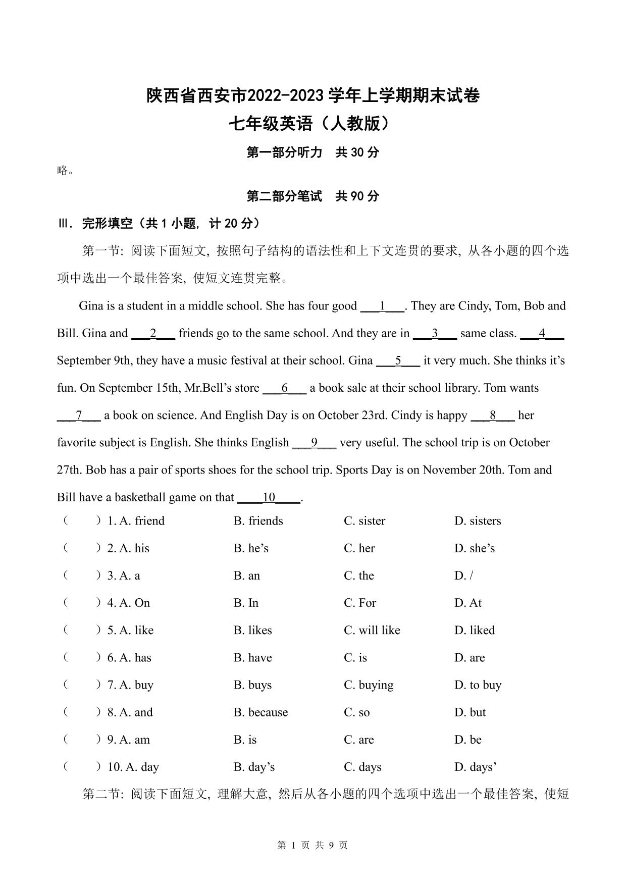 陕西省西安市2022—2023学年上学期期末试卷七年级英语(人教版)【无听力音频】