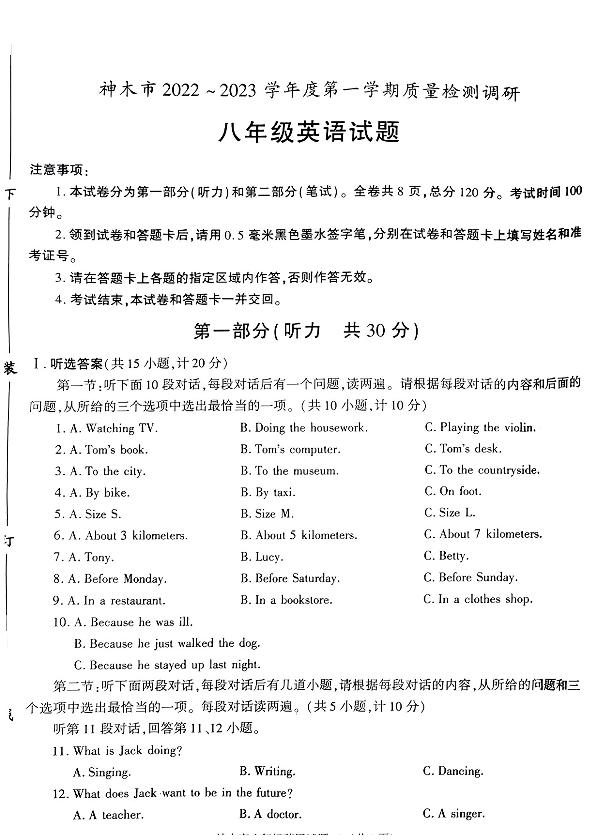 陕西省榆林市神木市2022—2023学年上学期期末考试试卷八年级英语(人教版)【无听力音频】