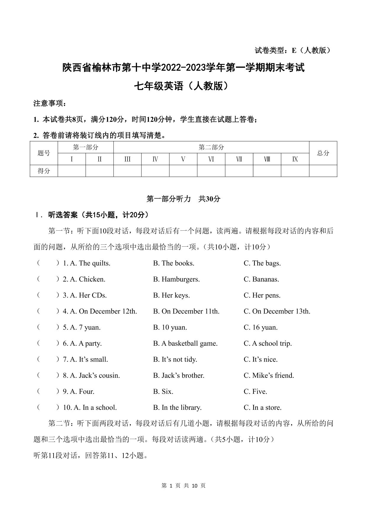 陕西省榆林市第十中学2022—2023学年第一学期期末考试七年级英语(人教版)【无听力音频】