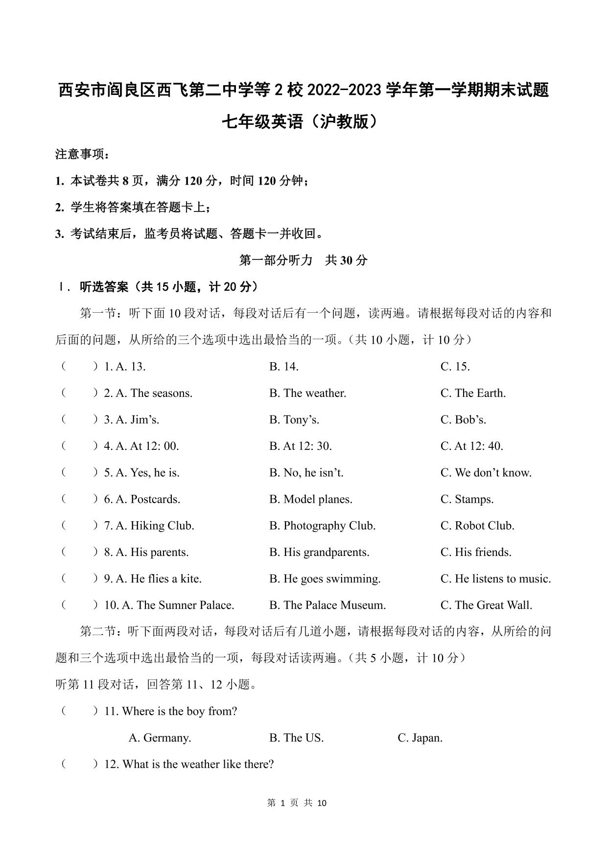 陕西省西安市阎良区西飞第二中学等2校2022—2023学年第一学期期末试题七年级英语(沪教版)【无听力音频】
