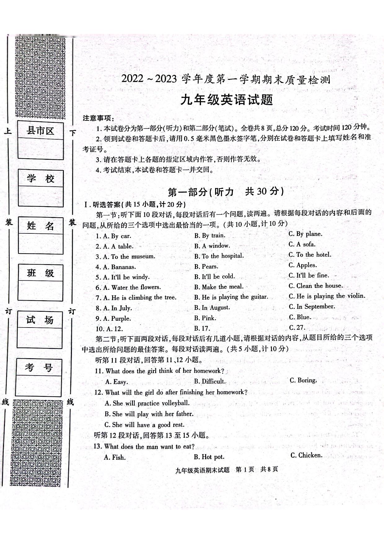 陕西省西安市长安区2022—2023学年上学期期末试卷九年级英语(沪教版)【无听力音频】