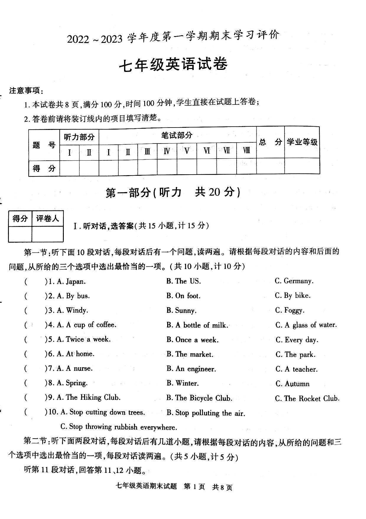 陕西省西安市长安区2022—2023学年上学期期末试卷七年级英语(沪教版)【无听力音频】