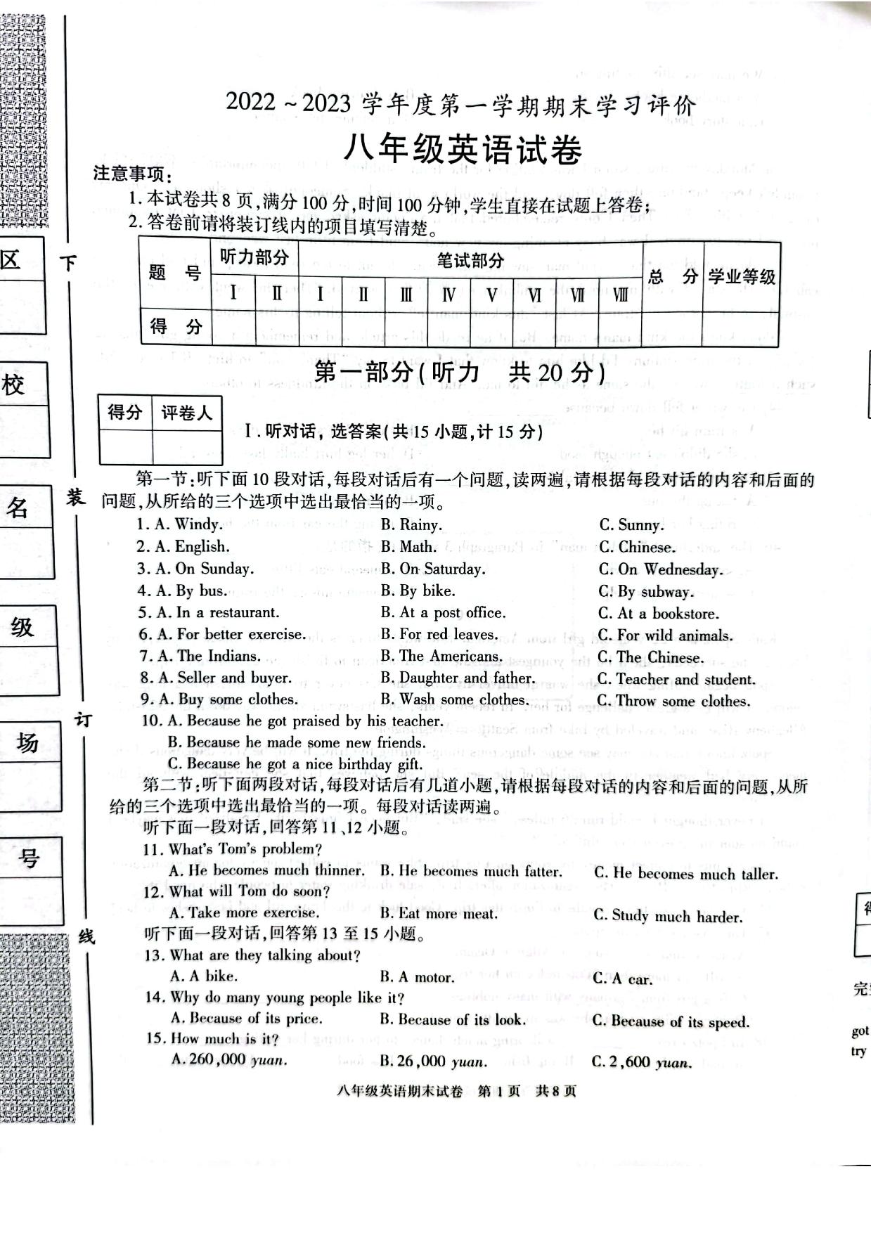 陕西省西安市长安区2022—2023学年上学期期末试卷八年级英语(沪教版)【无听力音频】