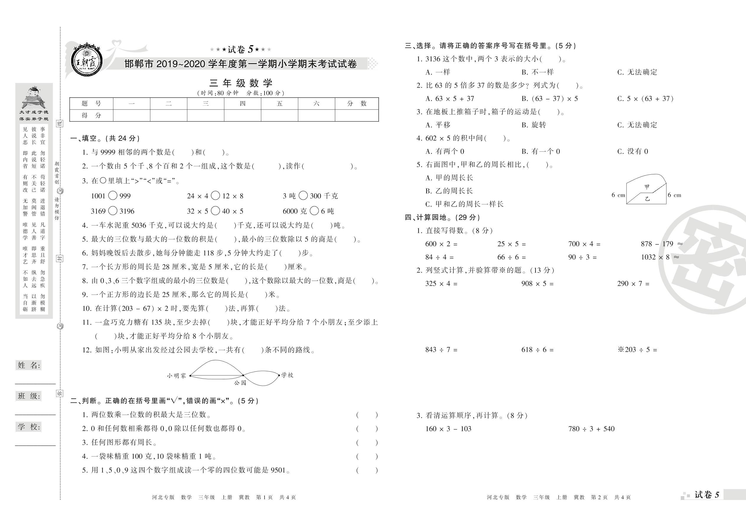 2019-2020学年第一学期邯郸市三年级数学试卷(冀教版)【5】