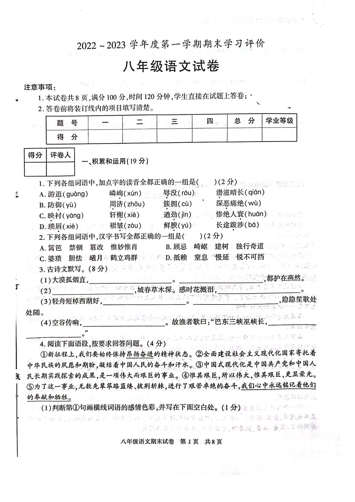 陕西省西安市长安区2022—2023学年上学期期末试题八年级语文(人教版)