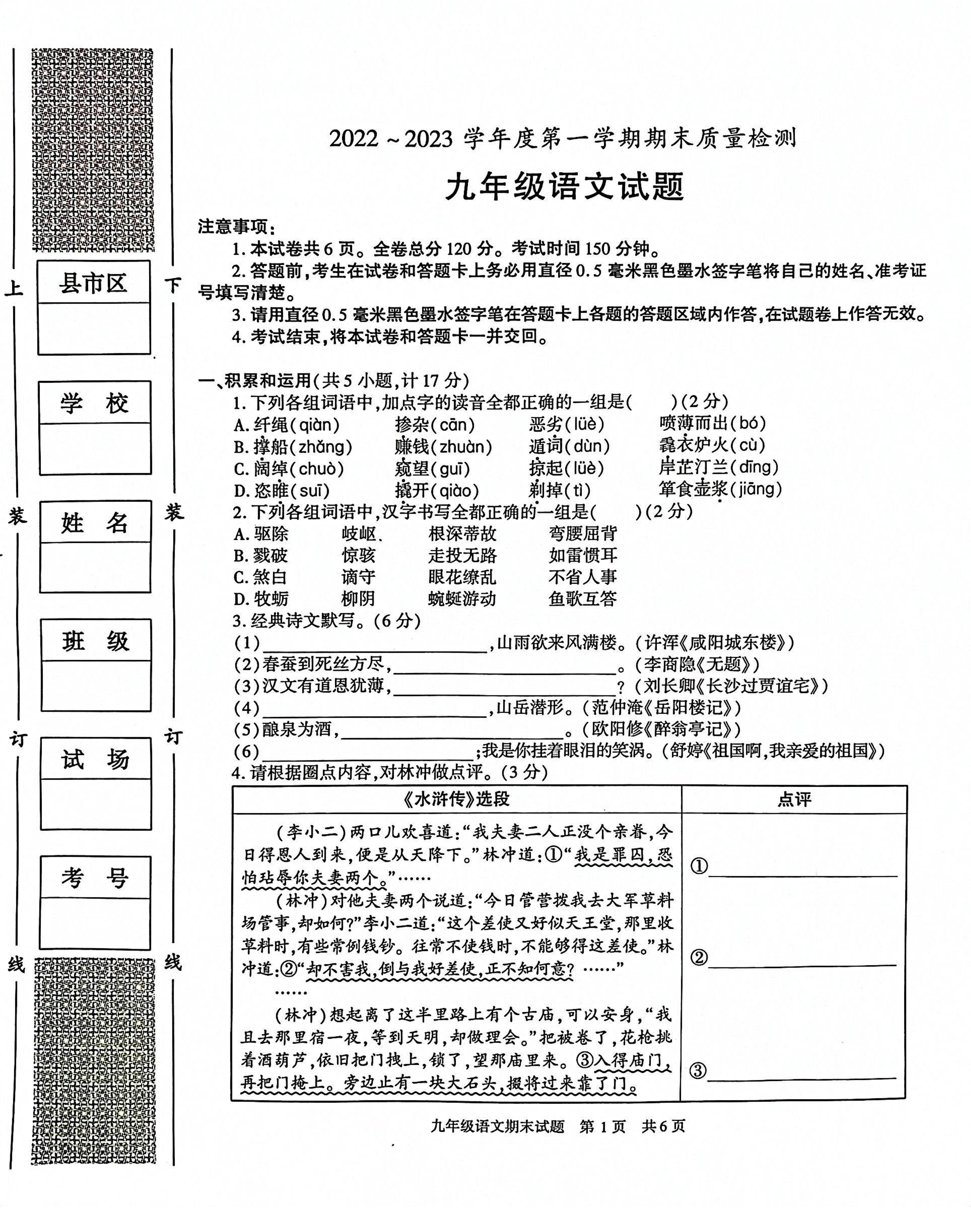 陕西省西安市长安区2022—2023学年上学期期末考试试卷九年级语文(人教版)