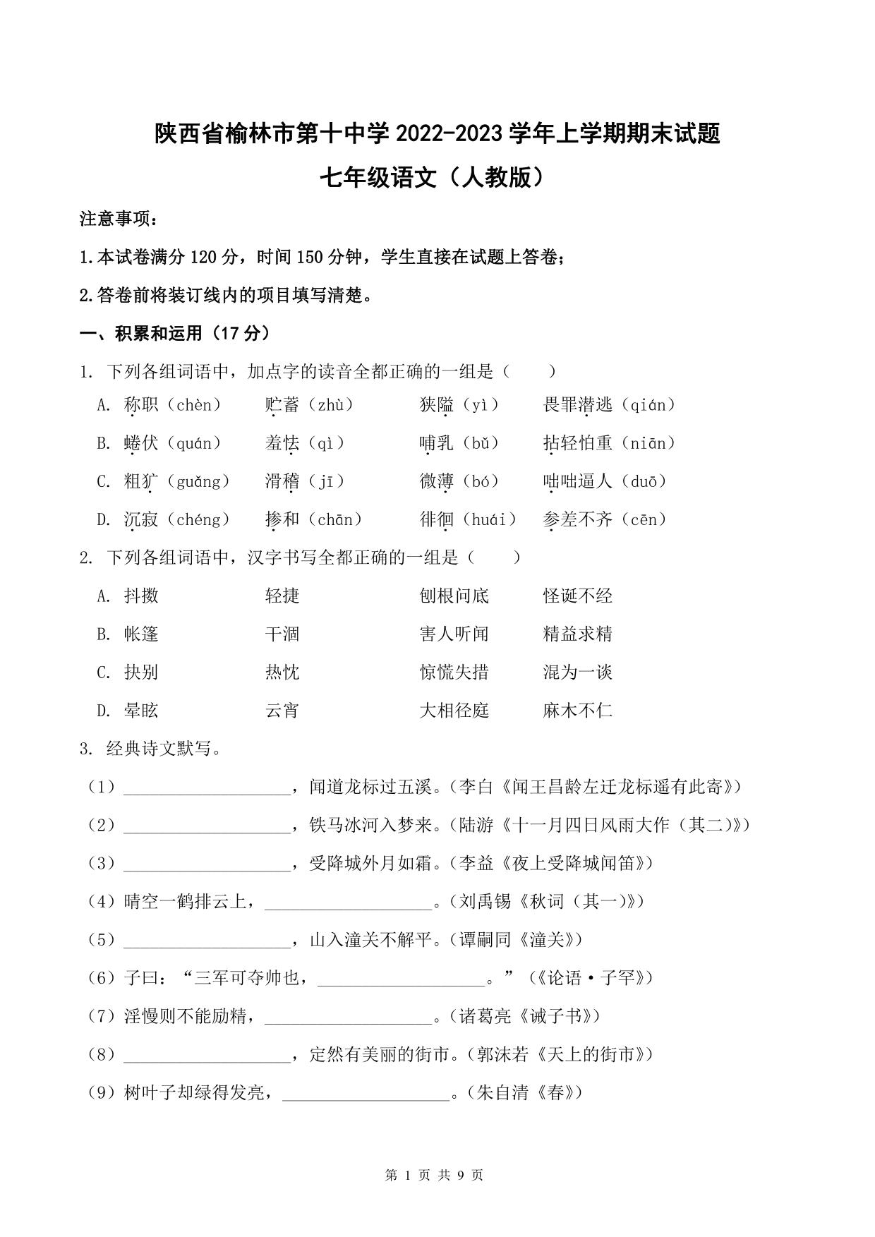 陕西省榆林市第十中学2022—2023学年上学期期末试题七年级语文(人教版)