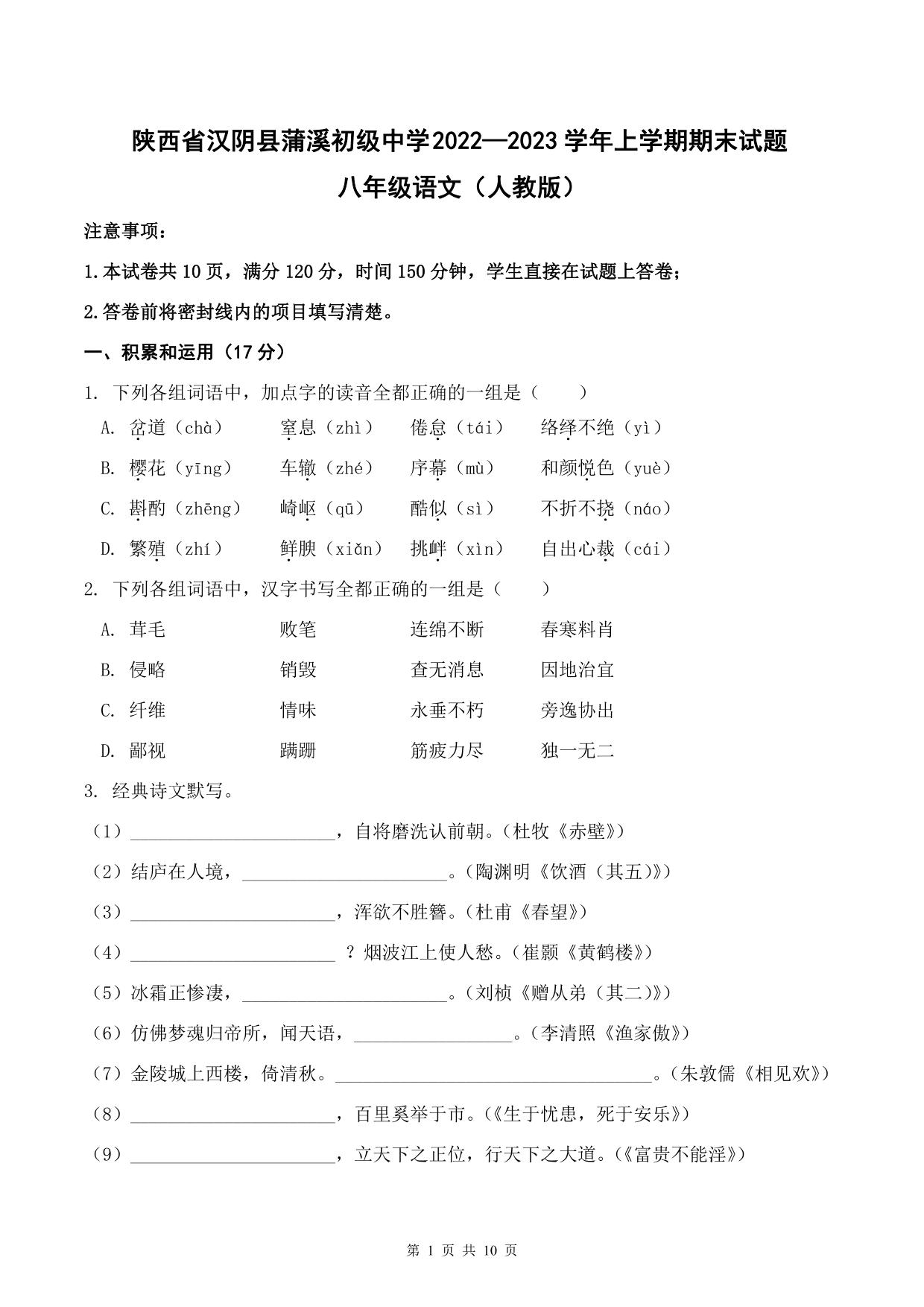 陕西省安康市汉阴县蒲溪初级中学2022—2023学年上学期期末试题八年级语文(人教版)