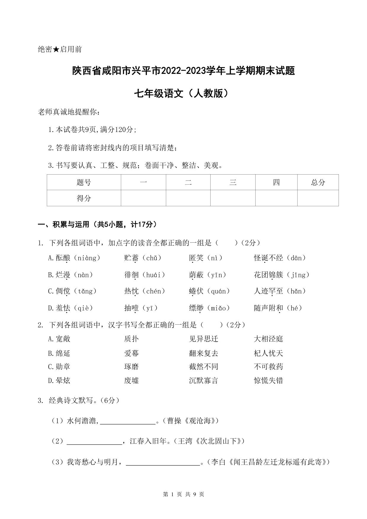 陕西省咸阳市兴平市2022—2023学年上学期期末试题七年级语文(人教版)