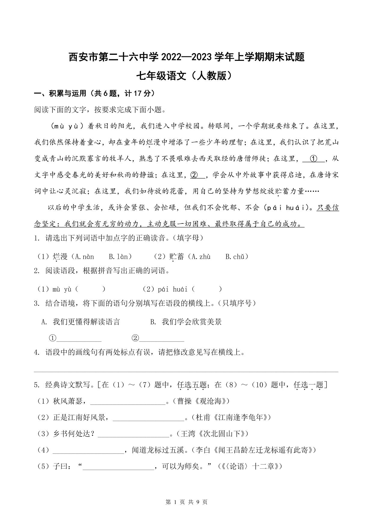 陕西省西安市第二十六中学2022—2023学年上学期期末试题七年级语文(人教版)