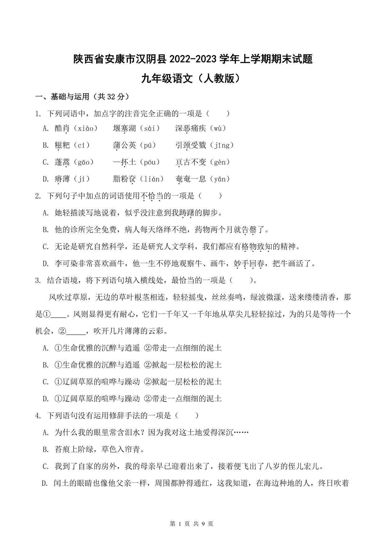 陕西省安康市汉阴县2022—2023学年上学期期末试题九年级语文(人教版)
