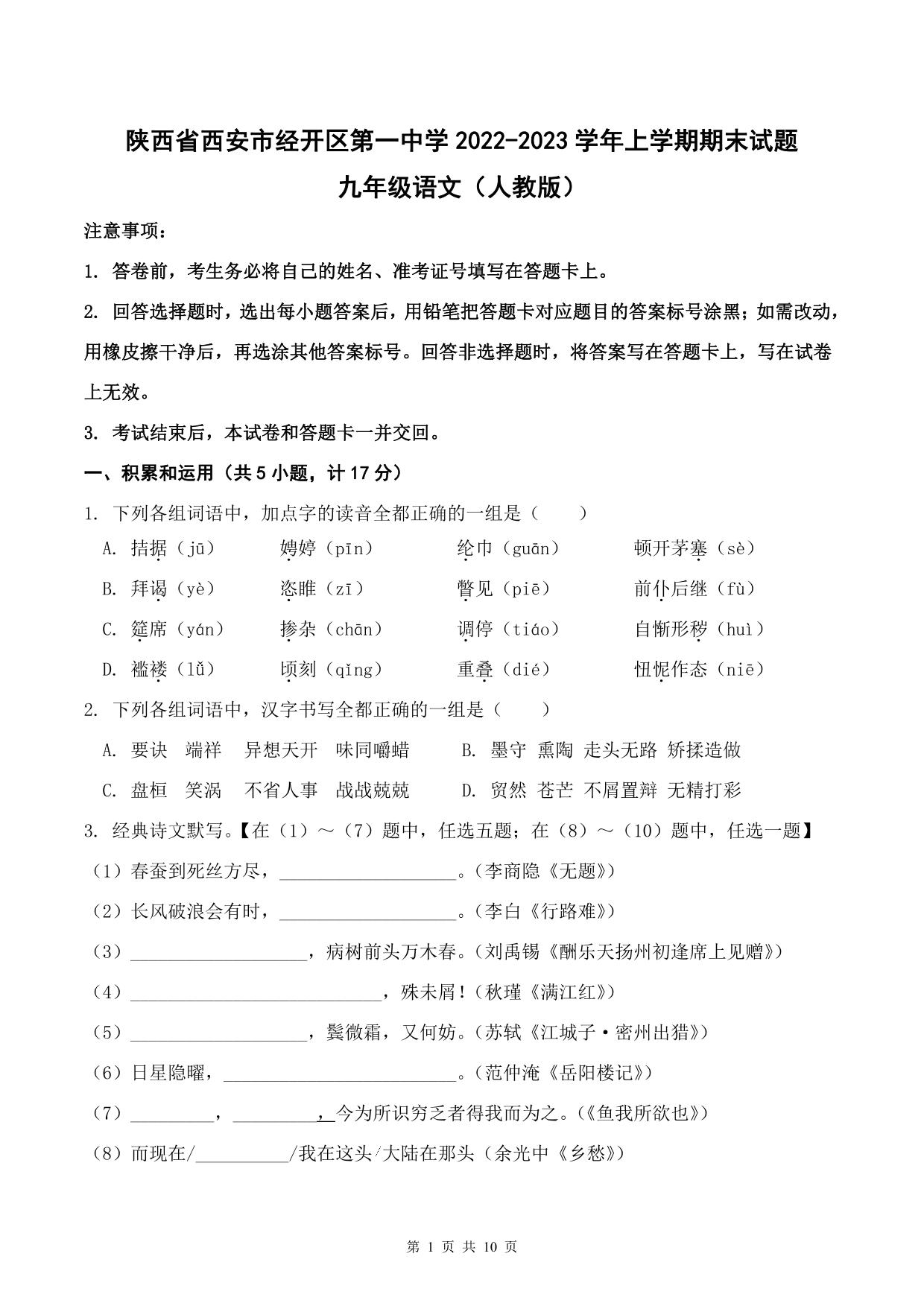 陕西省西安市经开区第一中学2022—2023学年上学期期末试题九年级语文(人教版)