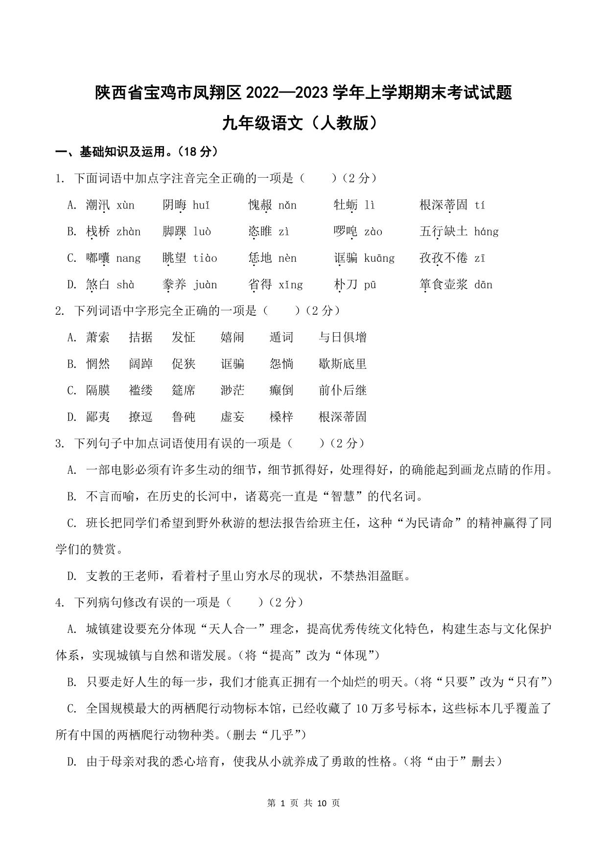 陕西省宝鸡市凤翔区2022—2023学年上学期期末考试试题九年级语文(人教版)
