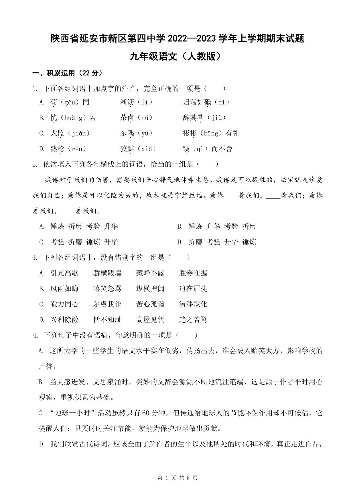 陕西省延安市新区第四中学2022—2023学年上学期期末试题九年级语文(人教版)