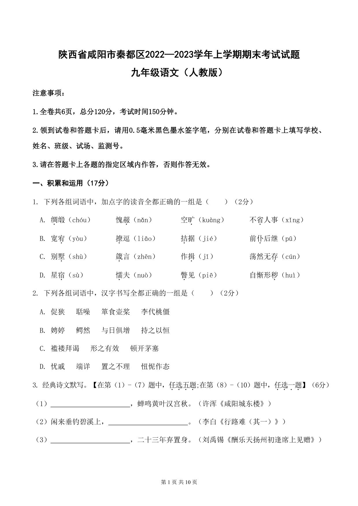 陕西省咸阳市秦都区2022—2023学年上学期期末考试试题九年级语文(人教版)