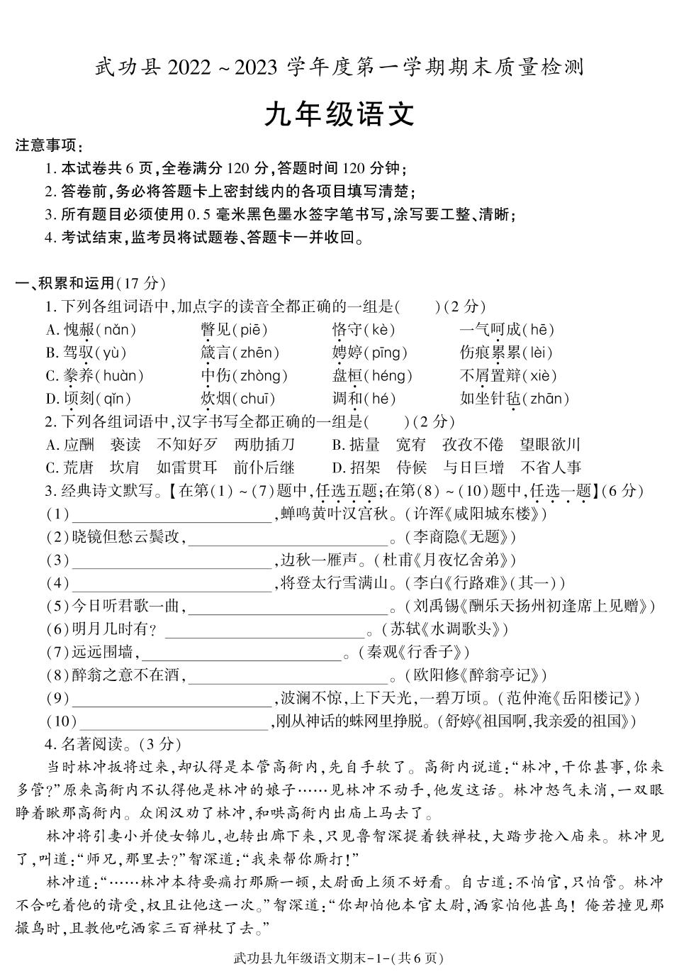陕西省咸阳市武功县2022—2023学年上学期期末质量检测试题九年级语文(人教版)