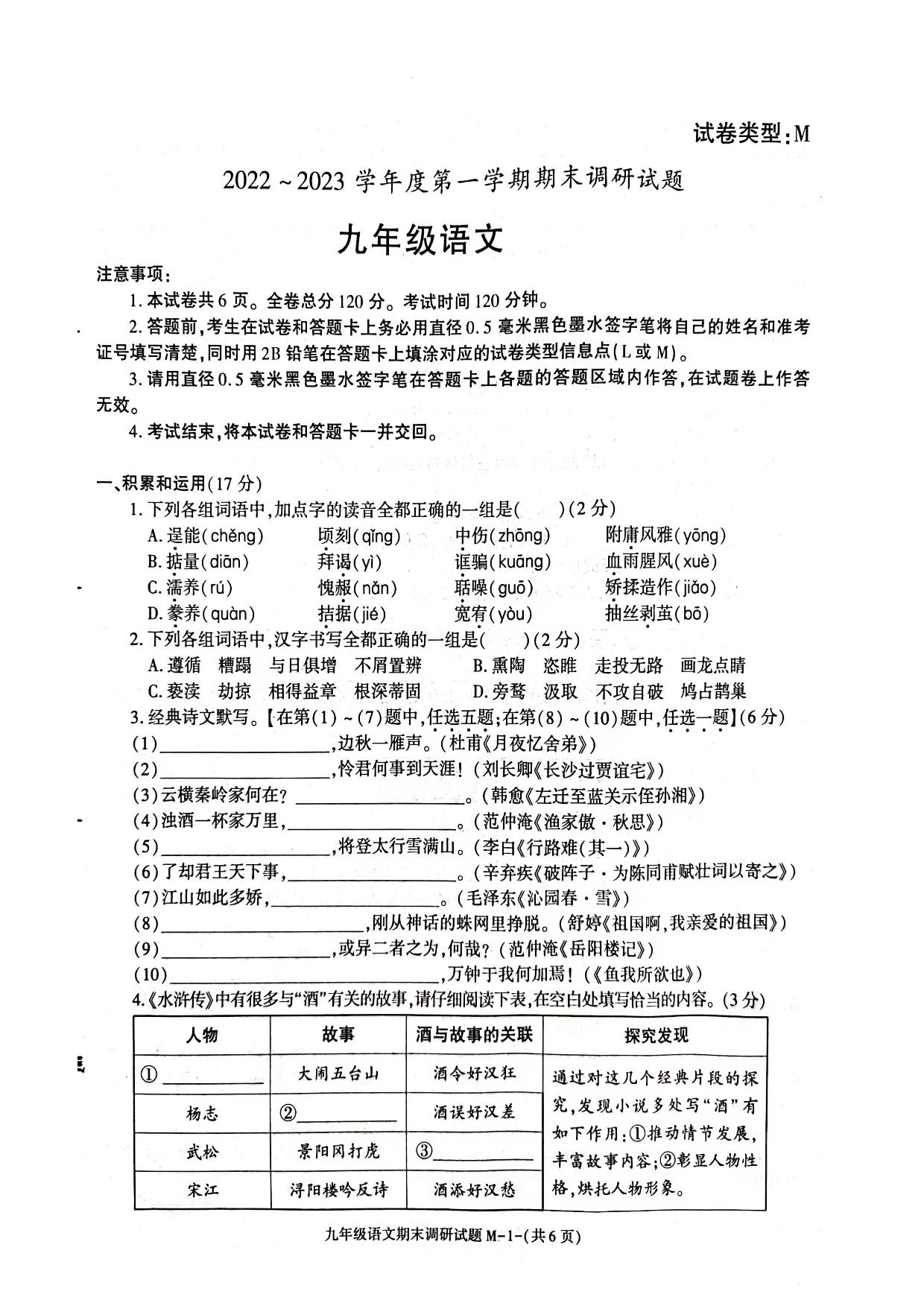 陕西省韩城市新城区第四初级中学2022—2023学年上学期期末试题九年级语文(人教版)