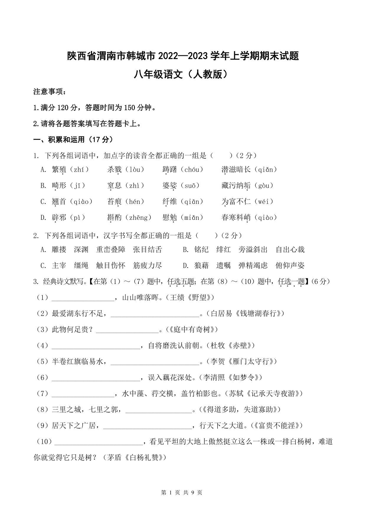 陕西省渭南市韩城市2022—2023学年上学期期末试题八年级语文(人教版)