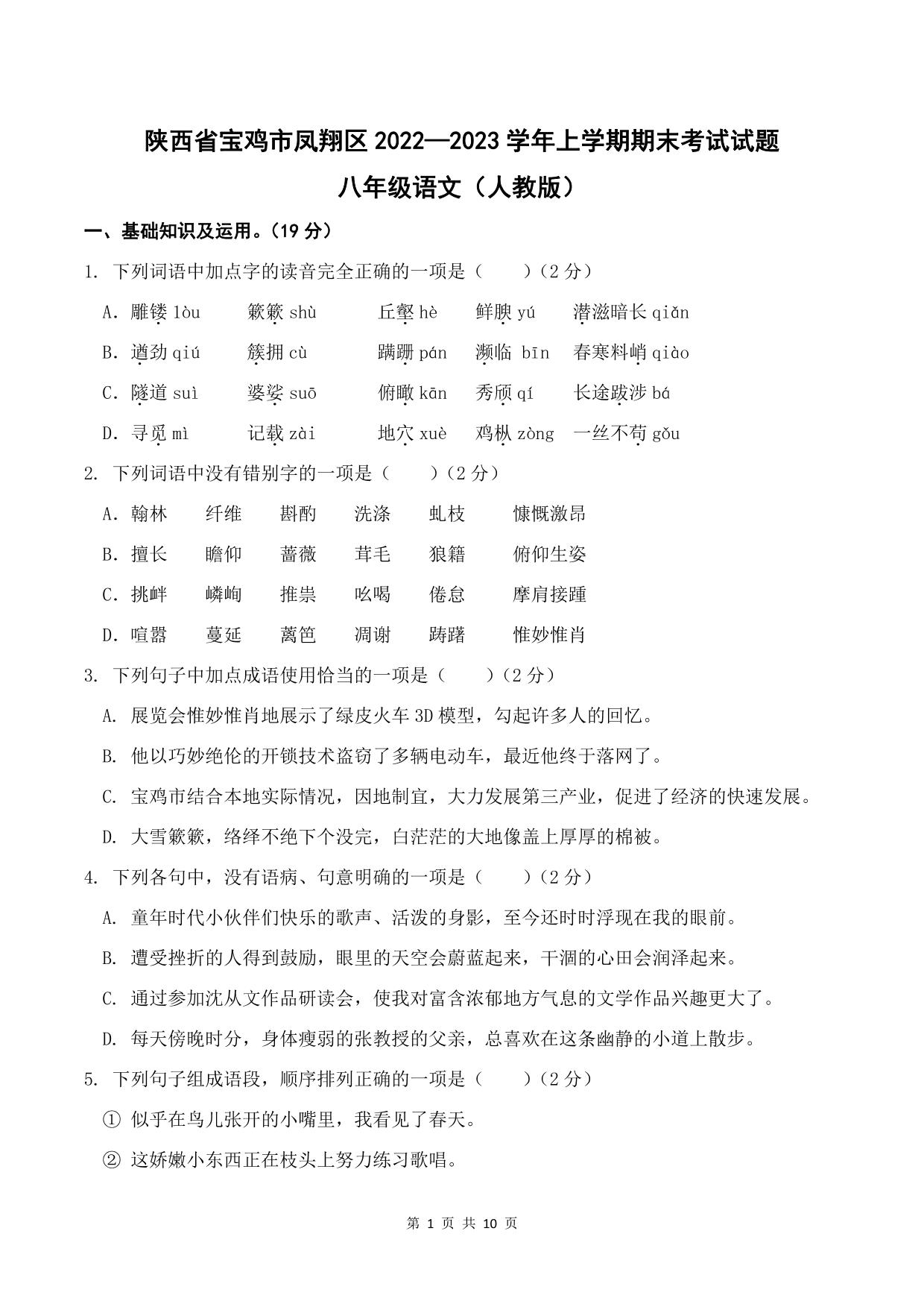 陕西省宝鸡市凤翔区2022—2023学年上学期期末考试试题八年级语文(人教版)正文