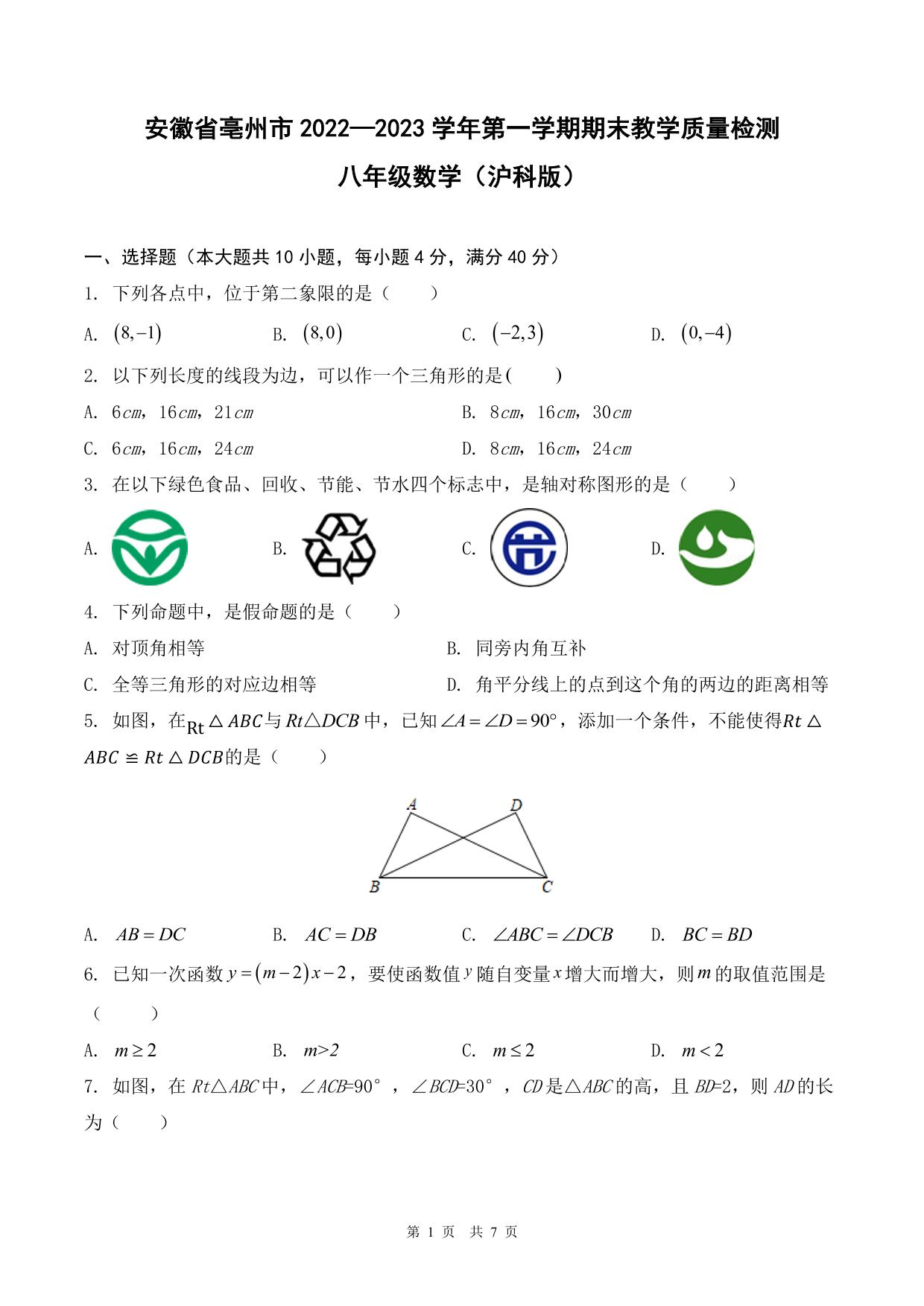 安徽省亳州市2022-2023学年度第一学期期末教学质量检测八年级数学(沪科版)
