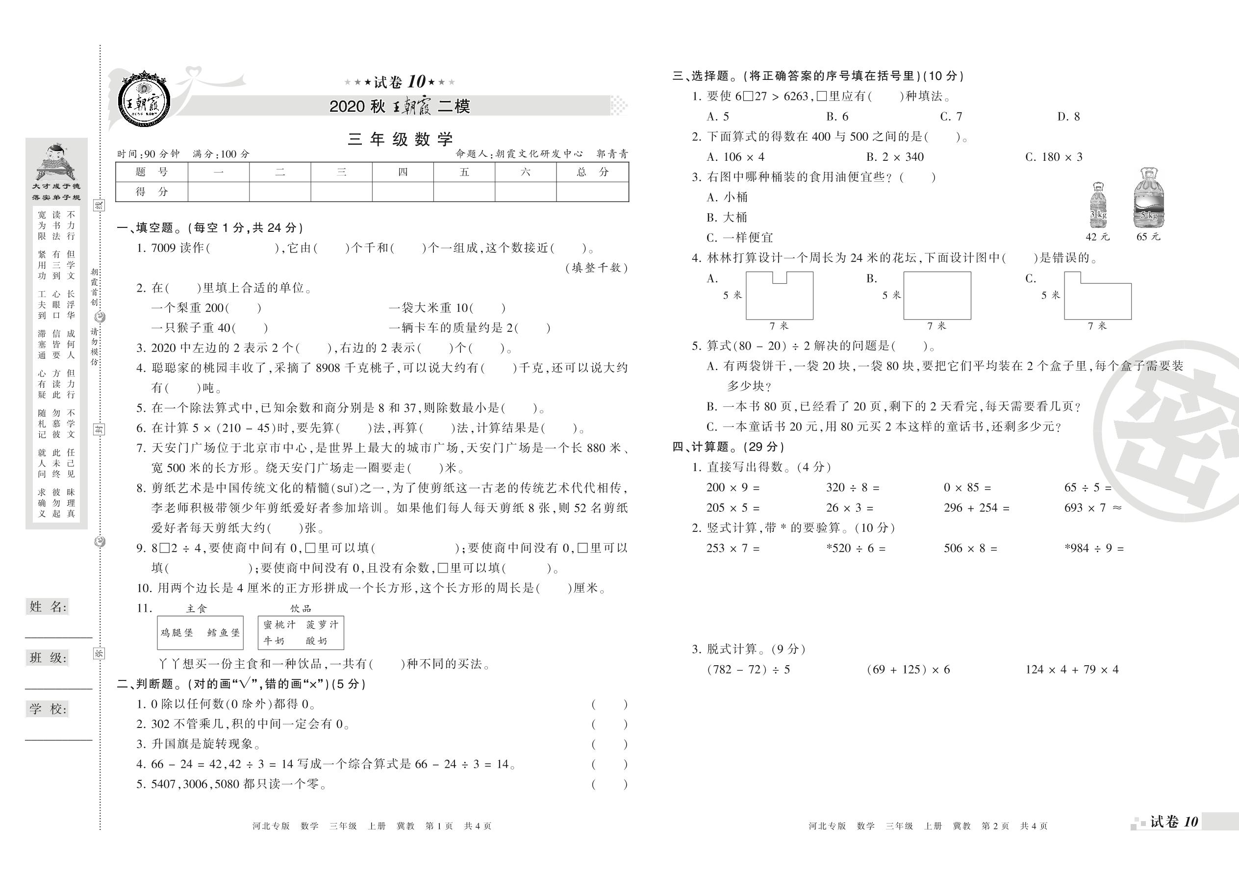 王朝霞期末模拟卷三年级上册数学(冀教版)_R21080491748【10】