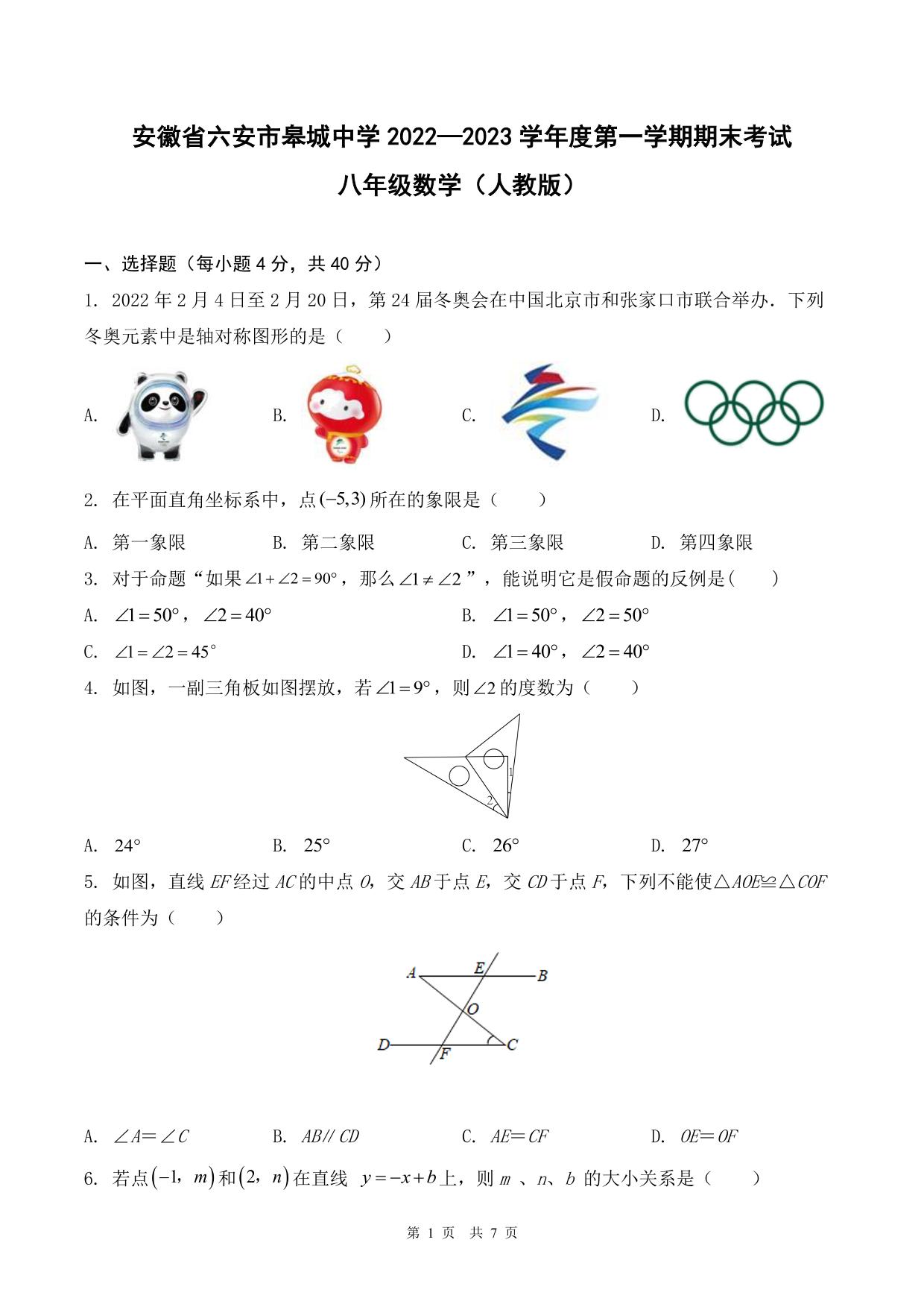 安徽省六安市皋城中学2022—2023学年度第一学期期末考试八年级数学(人教版)