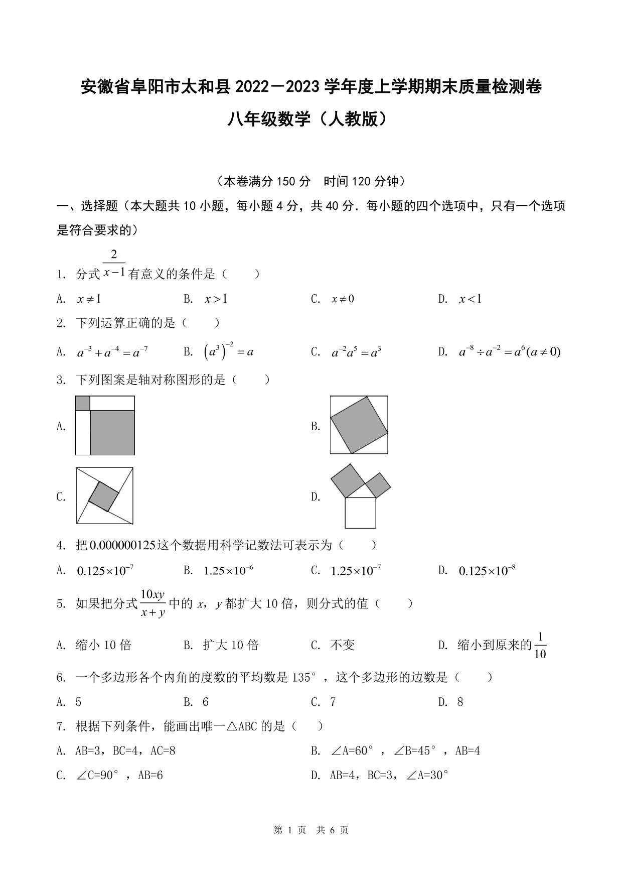 安徽省阜阳市太和县2022-2023学年度上学期期末质量检测卷八年级数学(沪科版)