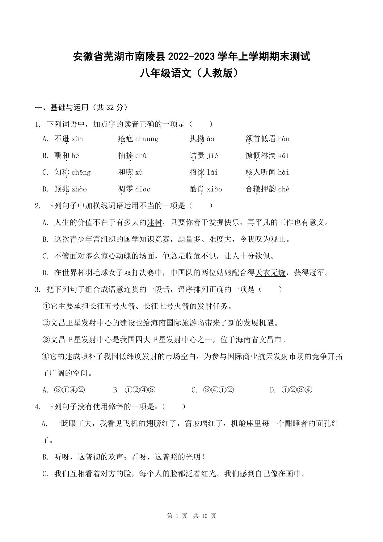 安徽省芜湖市南陵县2022-2023学年上学期期末测试八年级语文(人教版)