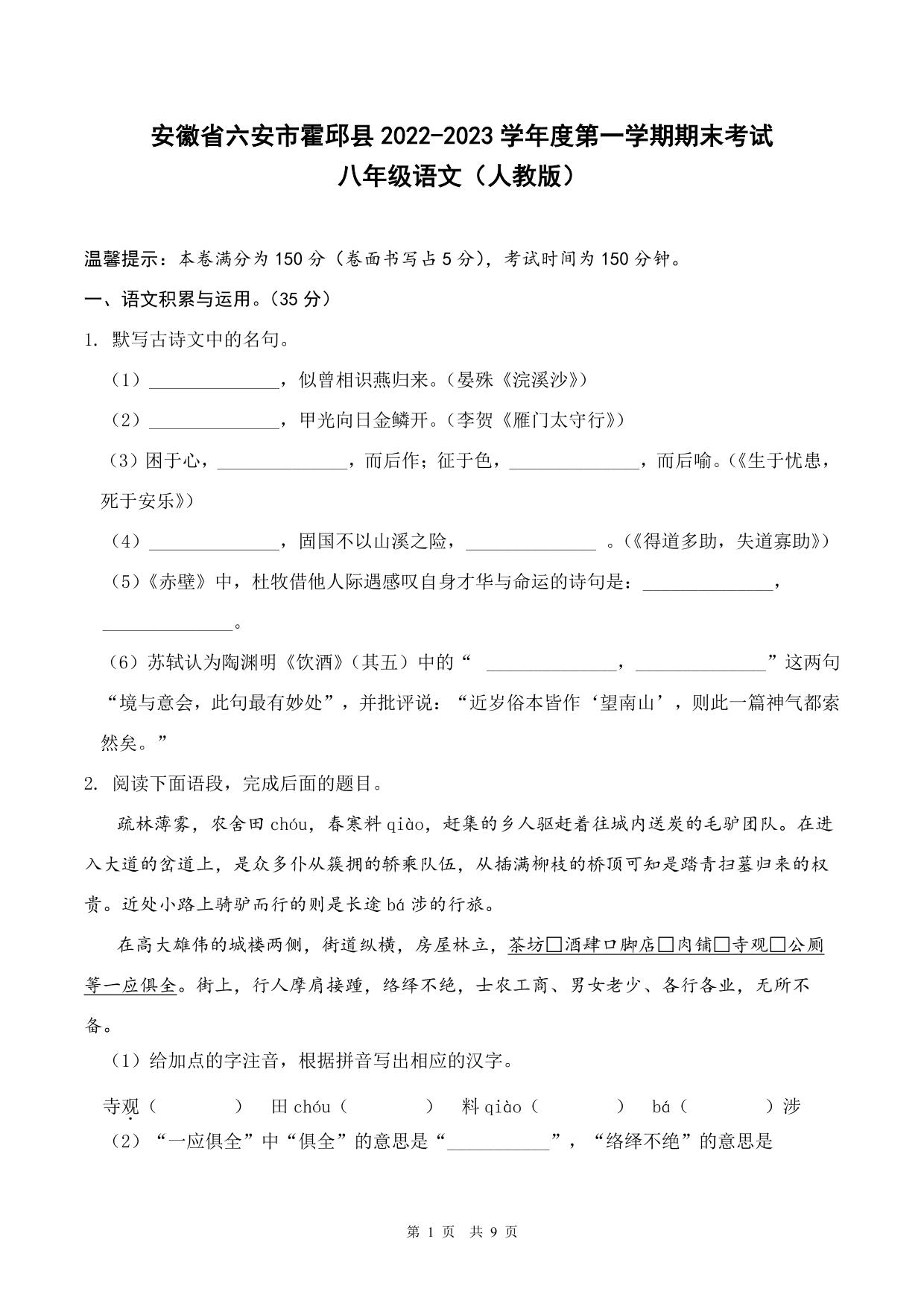 安徽省六安市霍邱县2022-2023学年度第一学期期末考试八年级语文(人教版)
