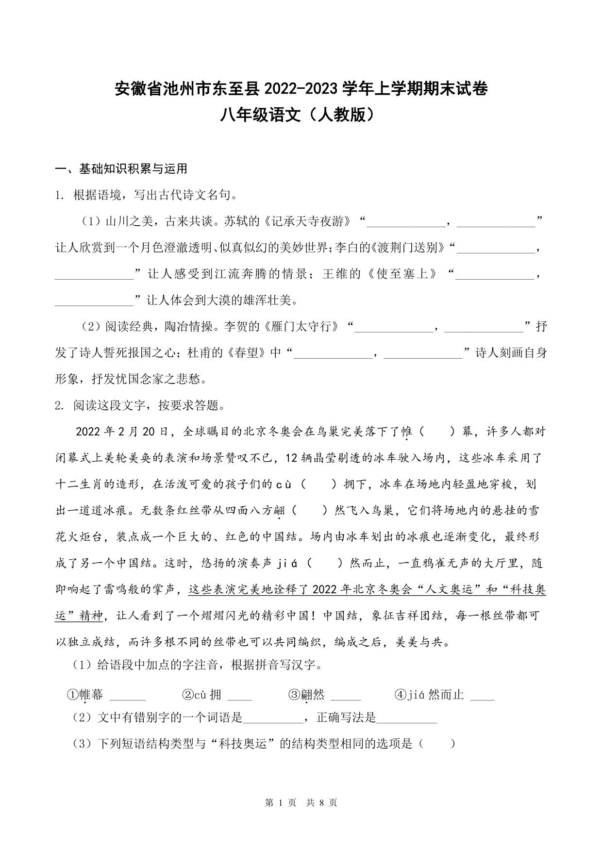 安徽省池州市东至县2022-2023学年上学期期末试卷八年级语文(人教版)