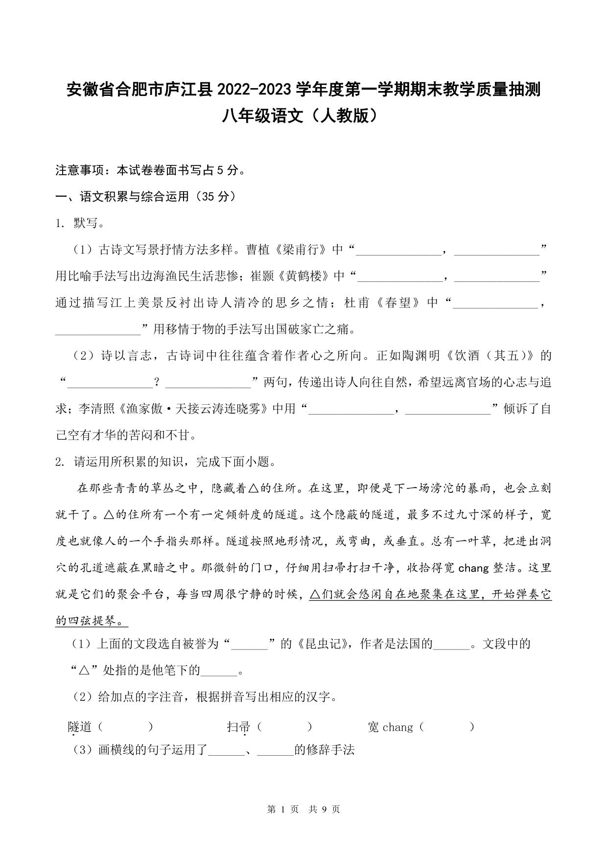 安徽省合肥市庐江县2022-2023学年第一学期期末教学质量抽测题八年级语文(人教版)