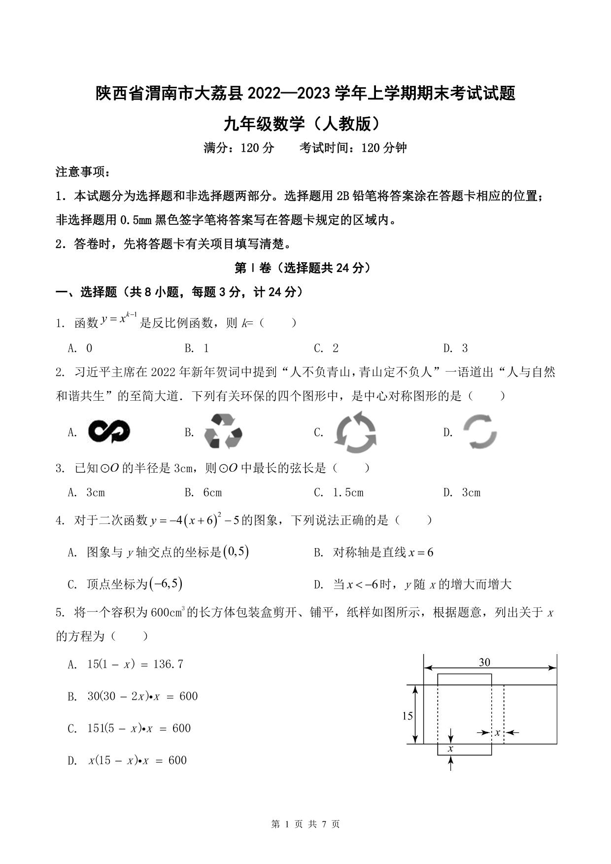 陕西省渭南市大荔县2022—2023学年上学期期末考试试题九年级数学(人教版)