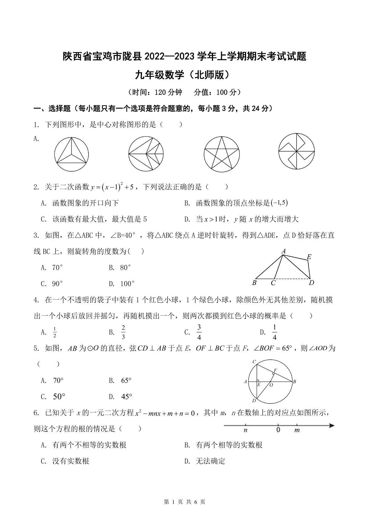陕西省宝鸡市陇县2022—2023学年上学期期末考试试题九年级数学(北师版)