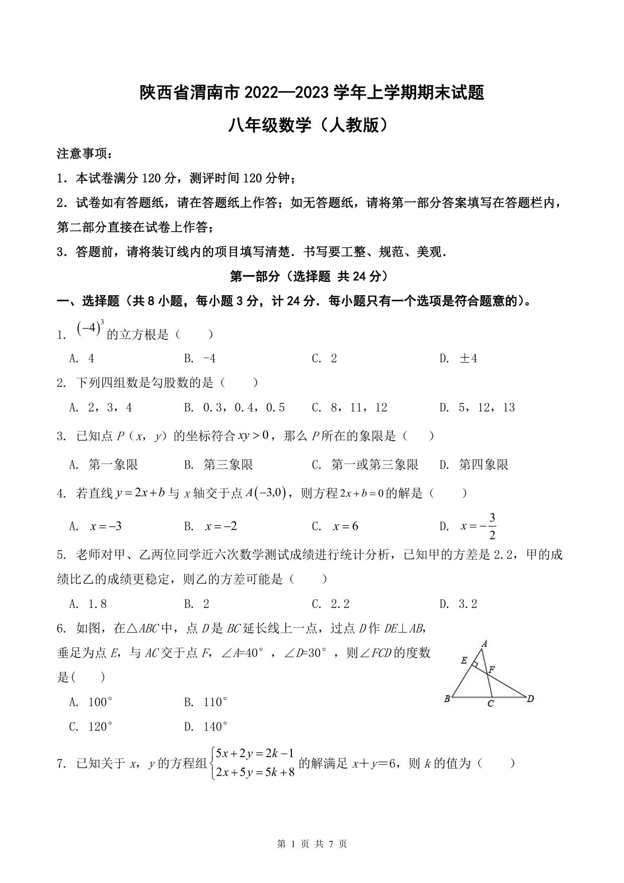 陕西省渭南市2022—2023学年上学期期末考试试题八年级数学(北师版)