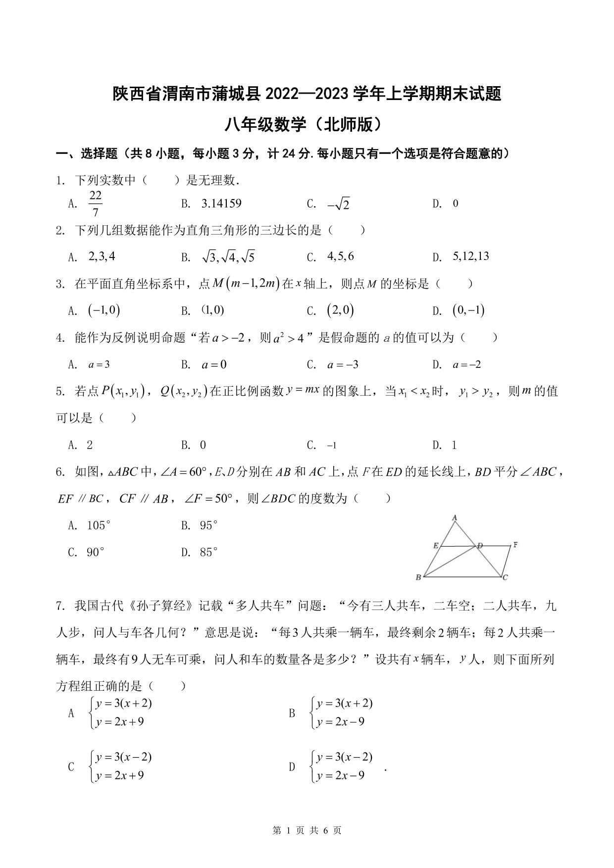 陕西省渭南市蒲城县2022—2023学年上学期期末试题八年级数学(北师版)