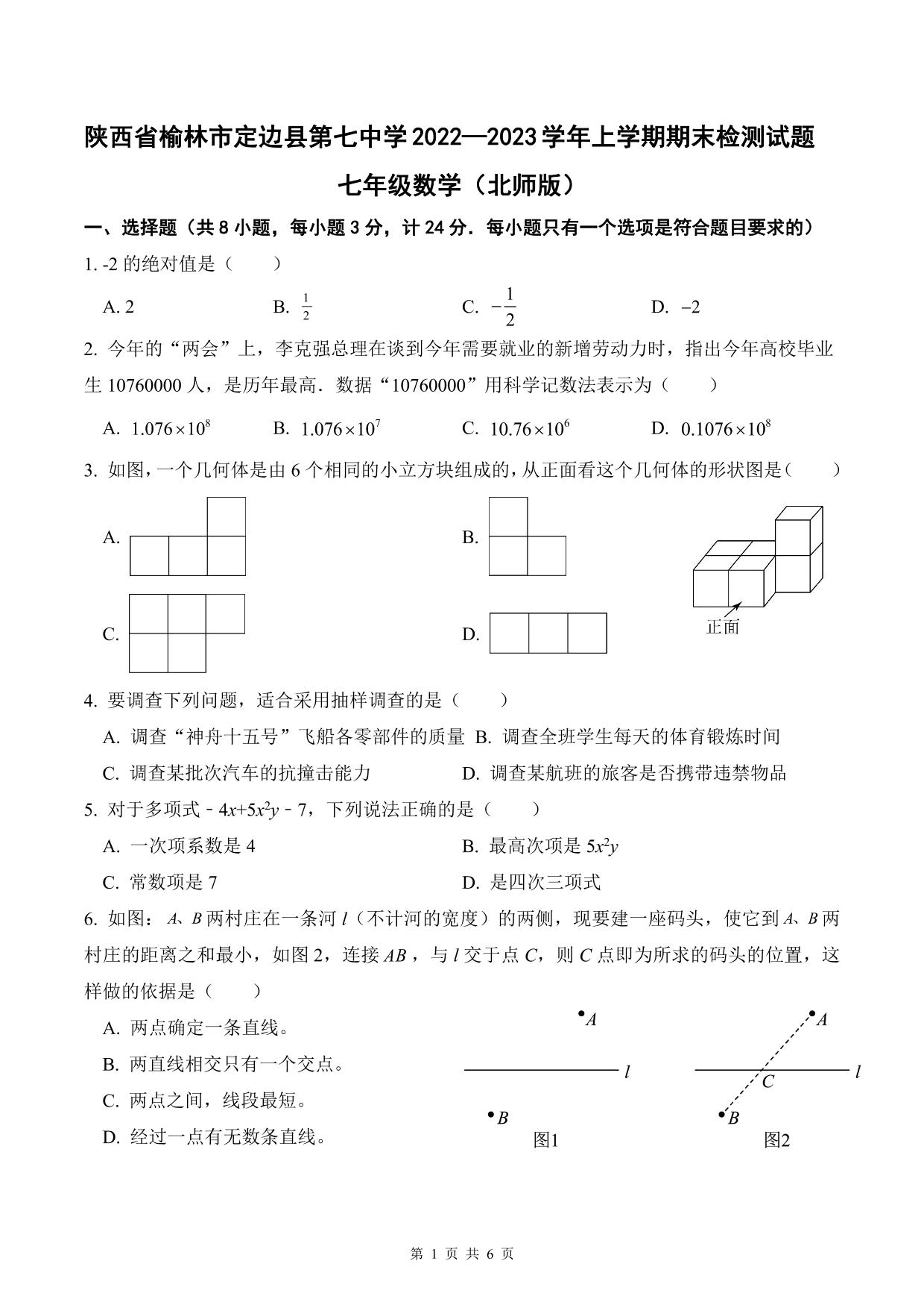 陕西省榆林市定边县第七中学2022—2023学年上学期期末检测试题七年级数学(北师版)