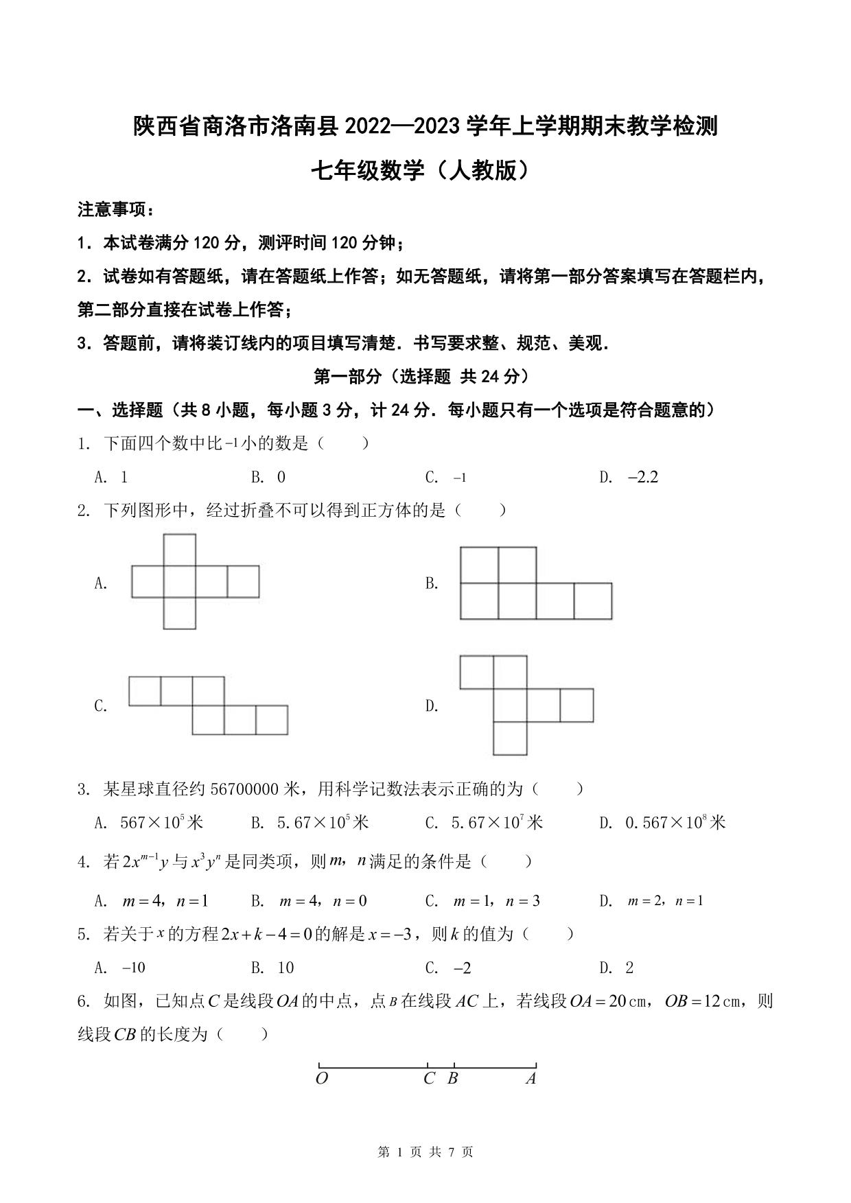 陕西省商洛市洛南县2022—2023学年上学期期末教学检测七年级数学(人教版)