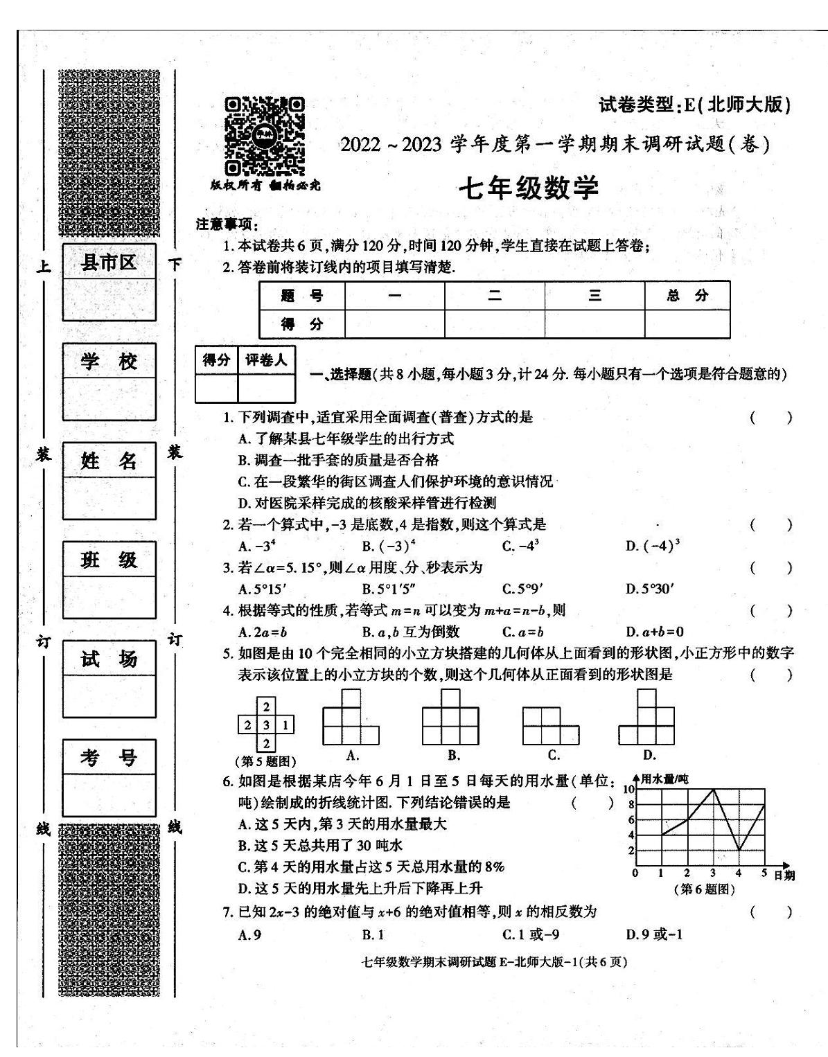 陕西省榆林市榆阳区第十中学2022—2023学年上学期期末考试试题七年级数学(北师版)