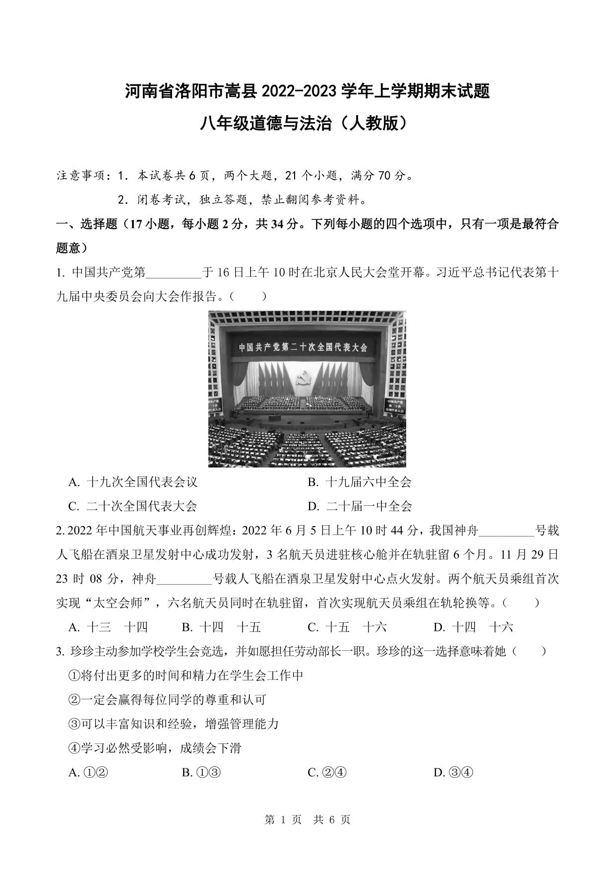 河南省洛阳市嵩县2022-2023学年上学期期末试题八年级道德与法治(人教版)