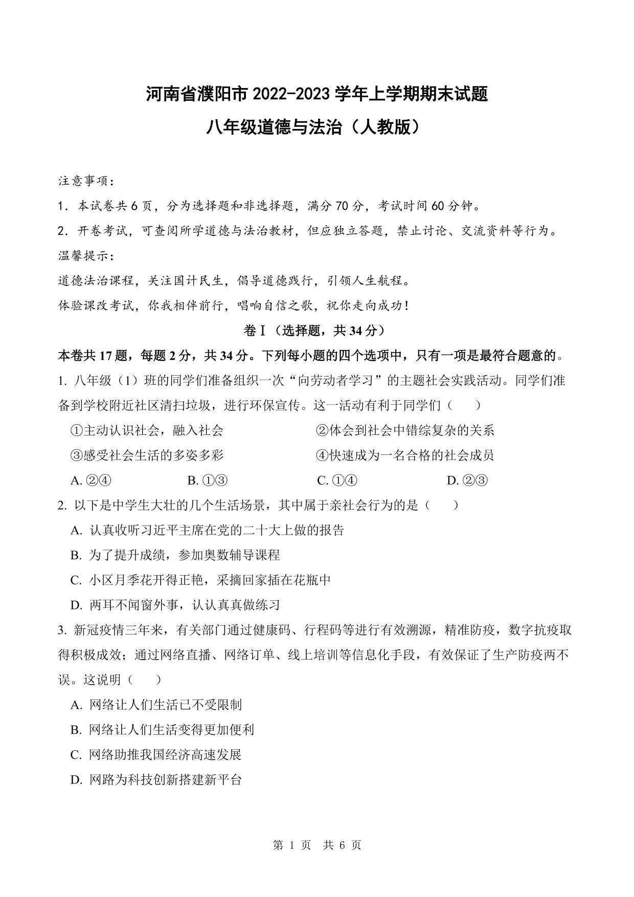 河南省濮阳市2022-2023学年上学期期末试题八年级道德与法治(人教版)