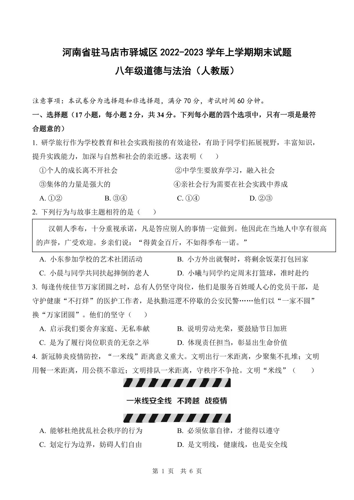河南省驻马店市驿城区2022-2023学年上学期期末试题八年级道德与法治(人教版)