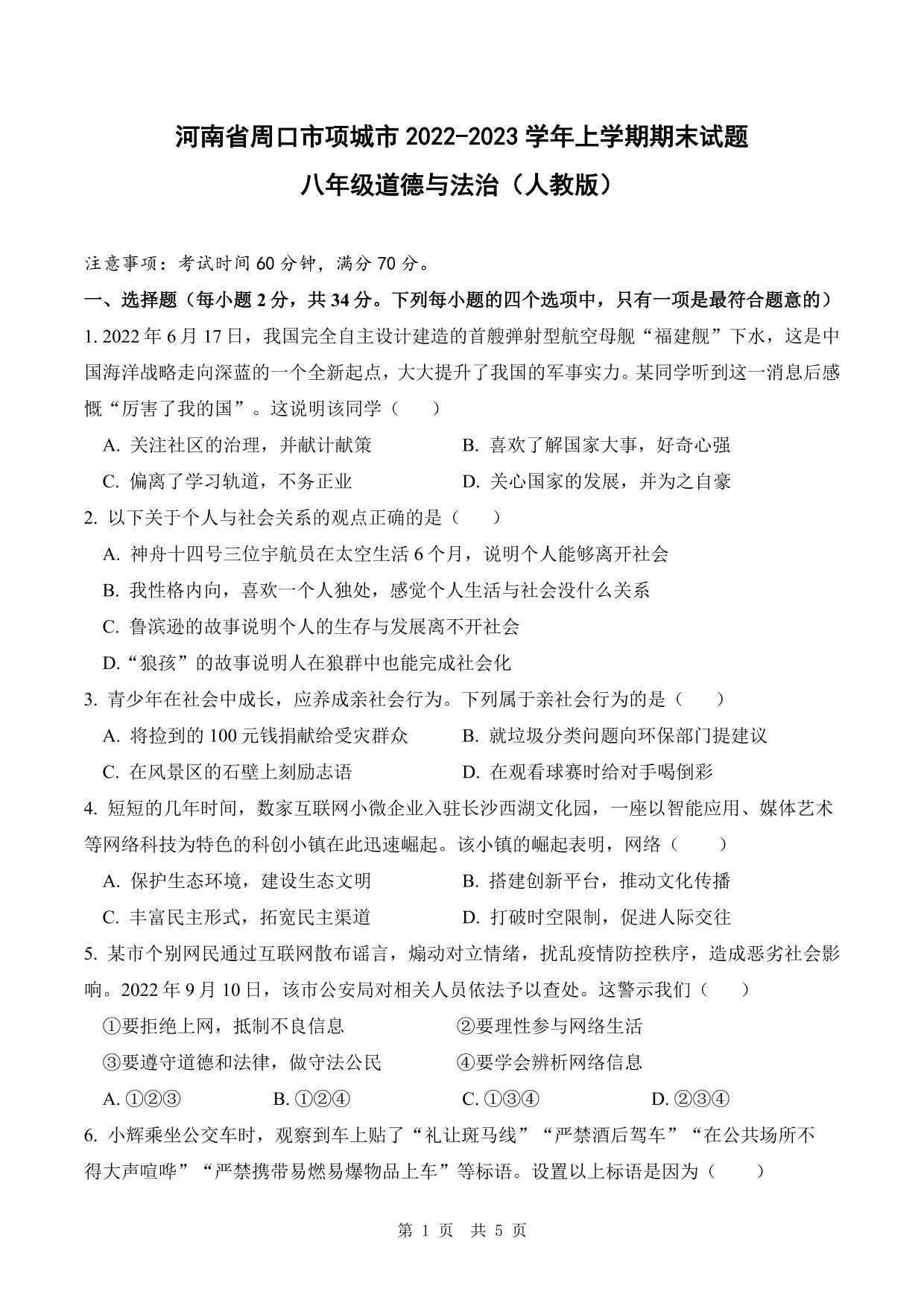 河南省周口市项城市2022-2023学年上学期期末试题八年级道德与法治(人教版)