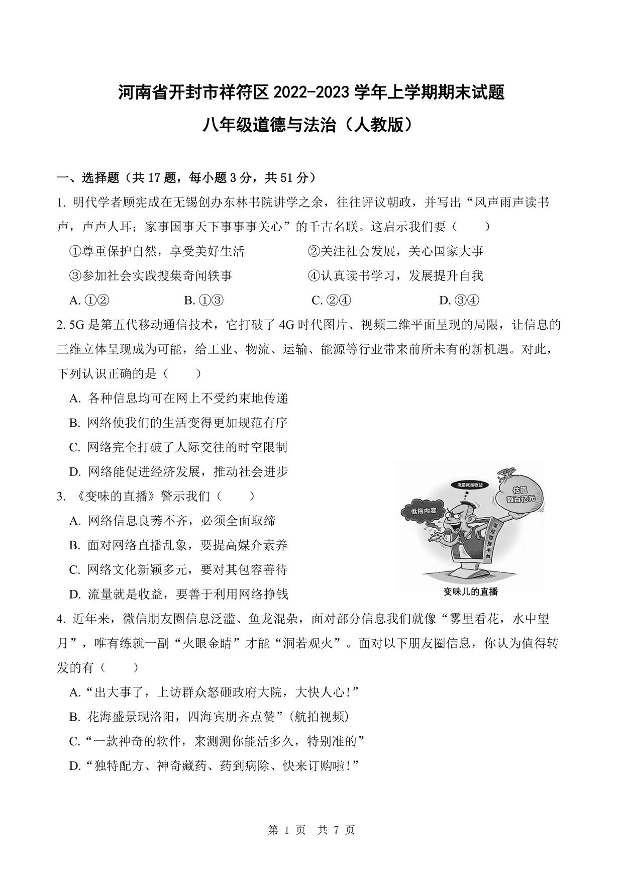 河南省开封市祥符区2022-2023学年上学期期末试题八年级道德与法治(人教版)