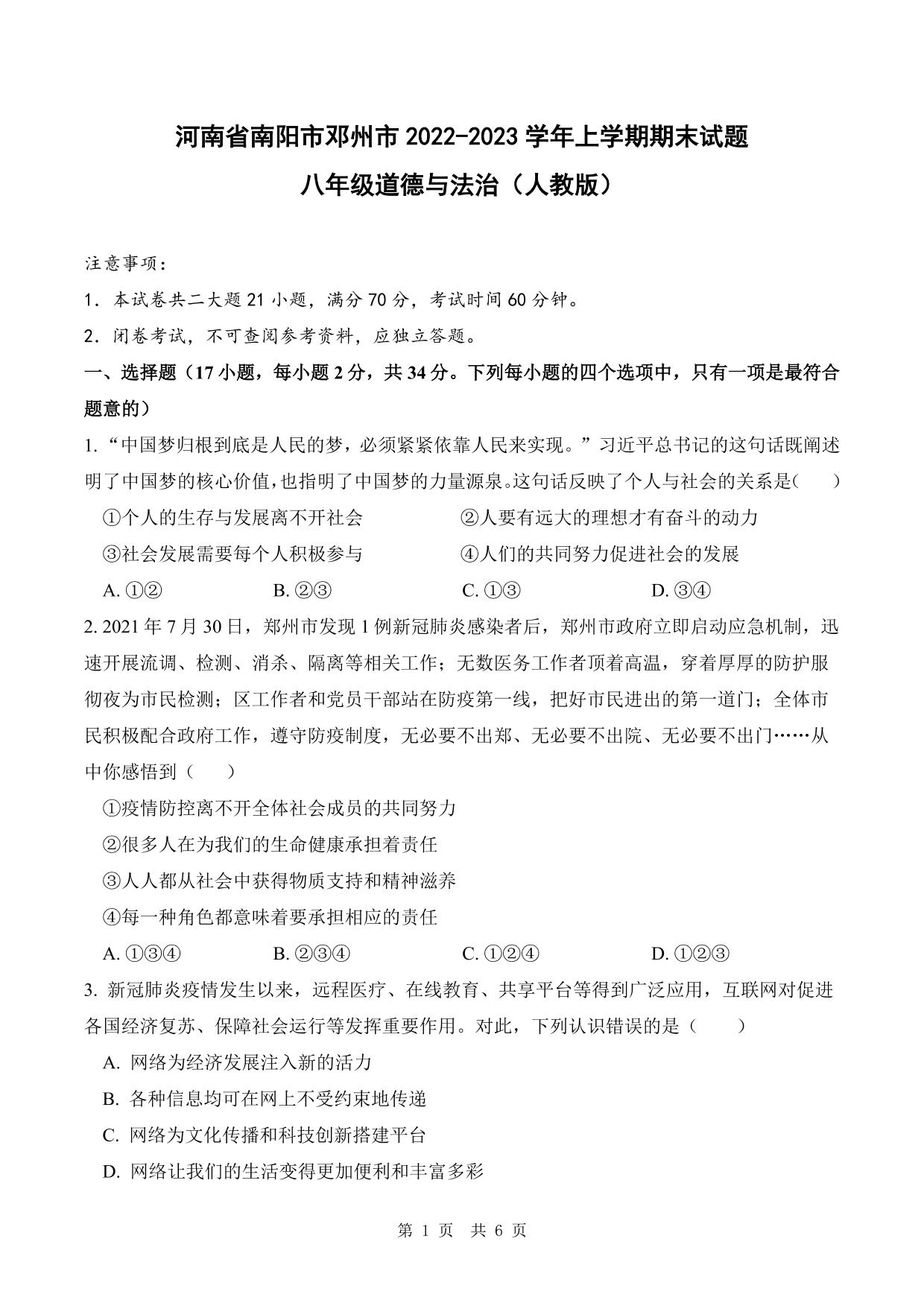 河南省南阳市邓州市2022-2023学年上学期期末试题八年级道德与法治(人教版)