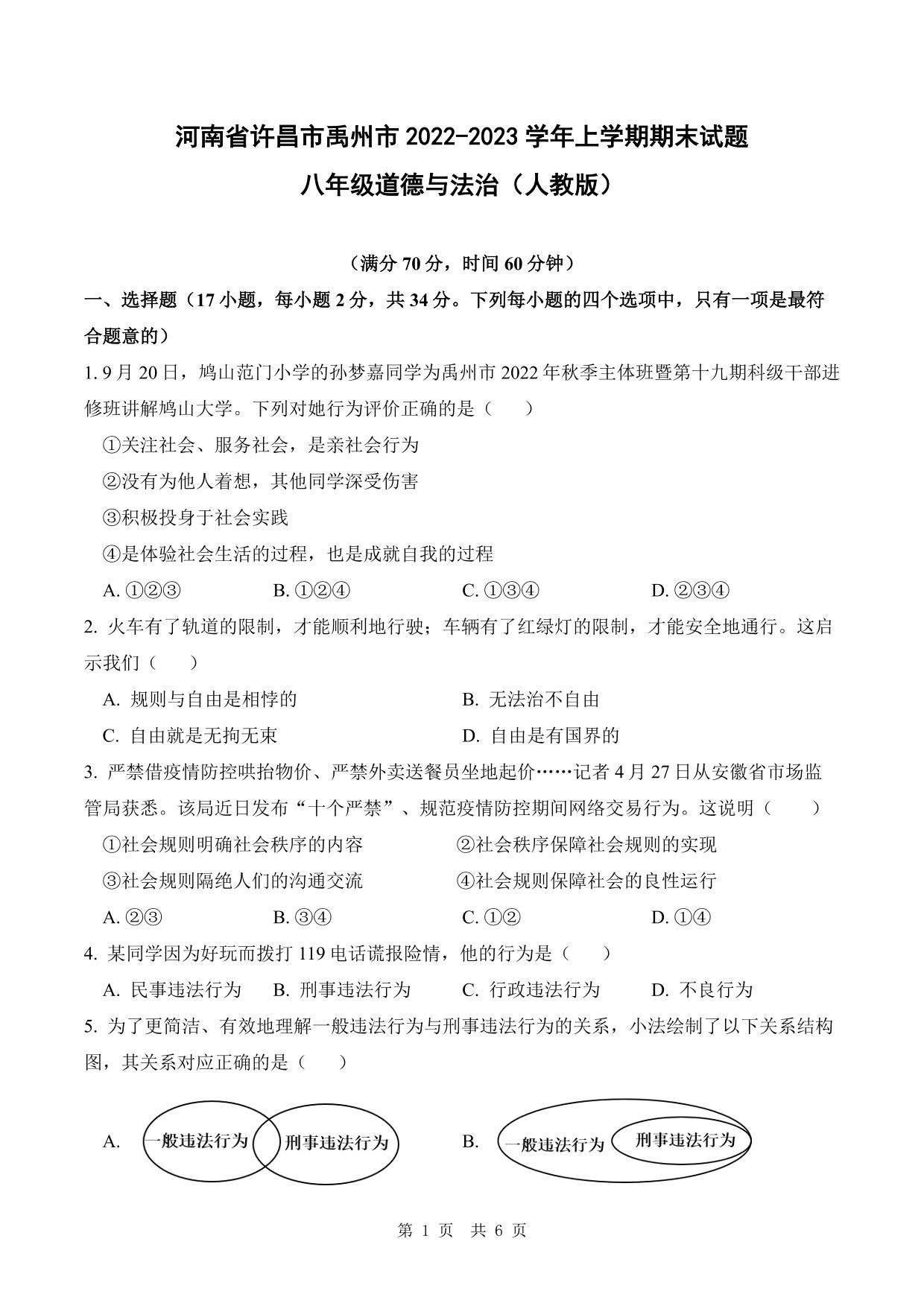 河南省许昌市禹州市2022-2023学年上学期期末试题八年级道德与法治(人教版)