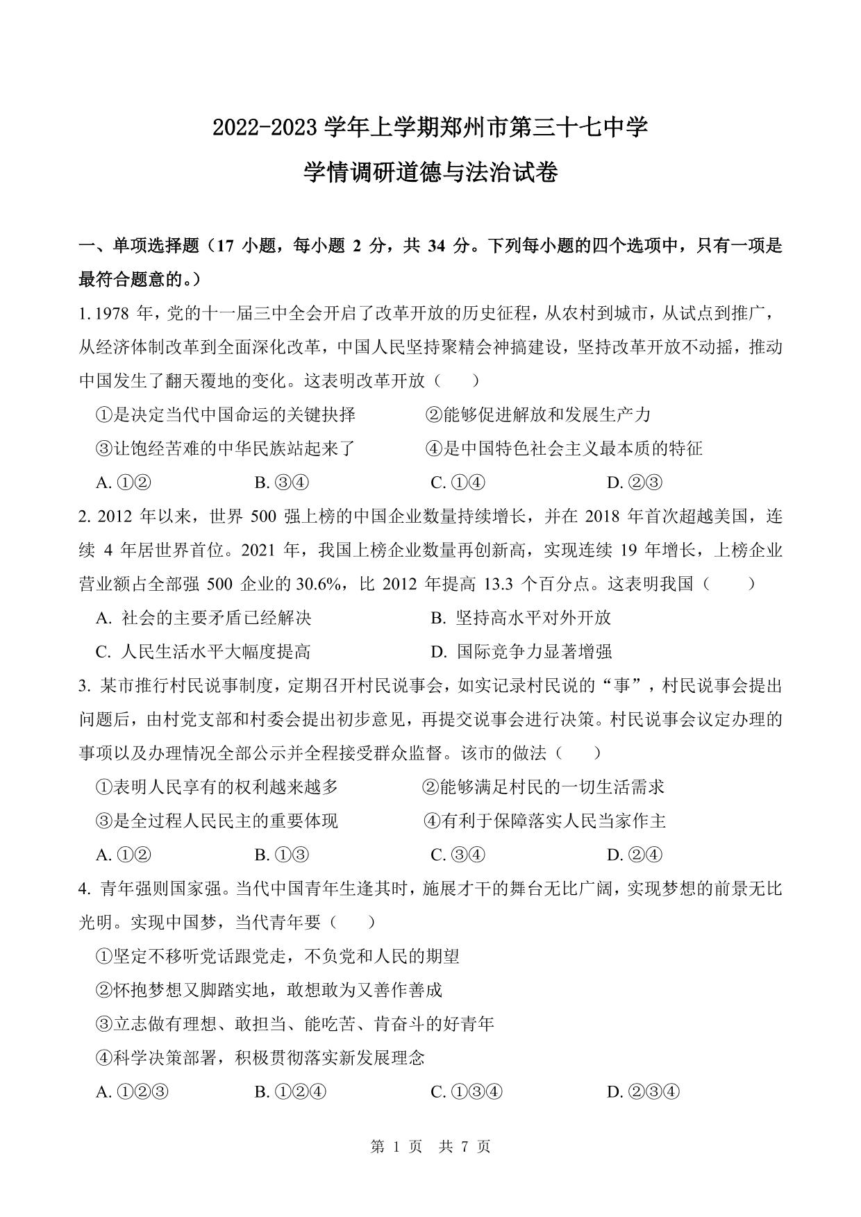 河南省郑州市第三十七中学2022-2023学年上学期期末学情调研试卷九年级道德与法治(人教版)