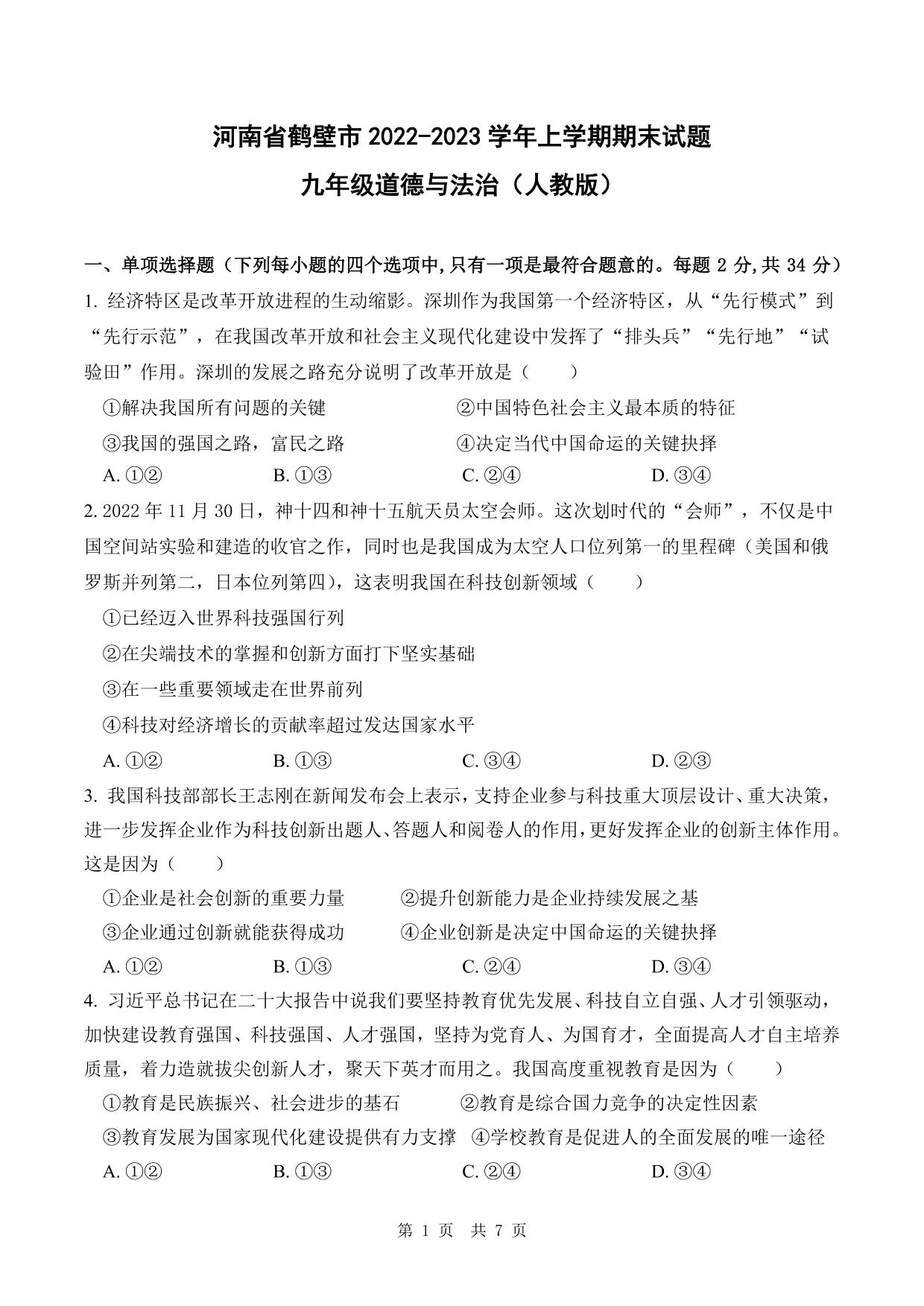 河南省鹤壁市2022-2023学年上学期期末试题九年级道德与法治(人教版)