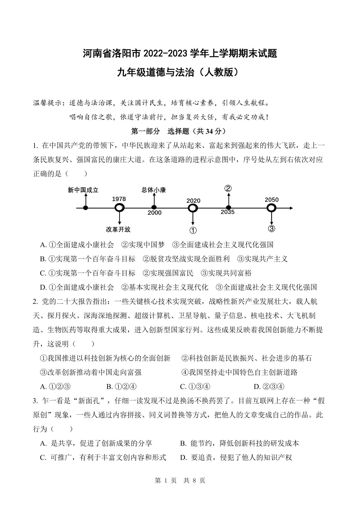 河南省洛阳市2022-2023学年上学期期末试题九年级道德与法治(人教版)