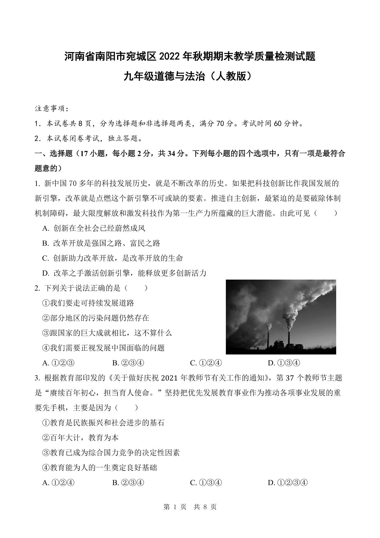 河南省南阳市宛城区2022年秋期期末教学质量检测试题九年级道德与法治(人教版)